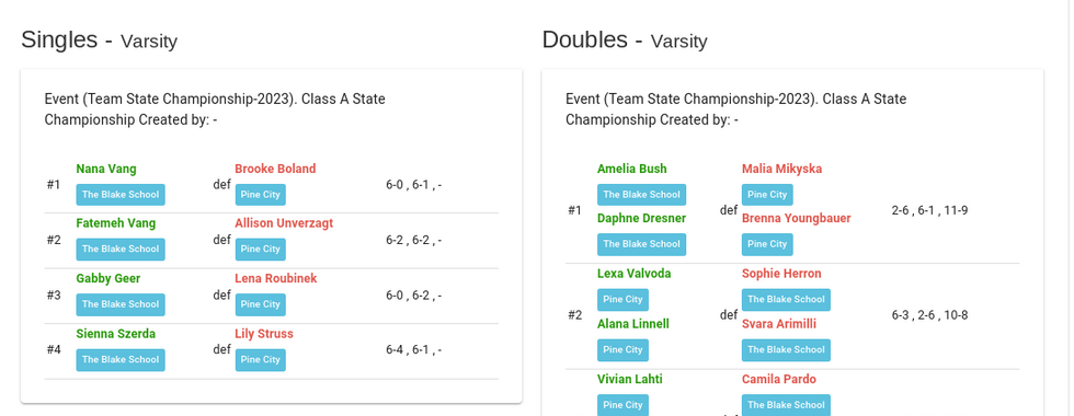 At first singles, Brooke had to battle at the net to beat her opponent. At second singles, Allison kept her opponent moving and dictated the match with her smart shots and aggressive play. Lena was strong and battled hard for each point, kept the ball deep, and created an opportunity to capitalize with her shot selection. Lily battled hard at 4th singles against a very consistent player. In doubles, the first double duo (Mikyska/Youngbauer) were strong and a force at the net with their overheads. Second doubles (Valvoda/Linnell) used their shot selection and movement to dominate. Our third doubles (Lahti/Unverzagt) played their best tennis of the season at the state tournament!